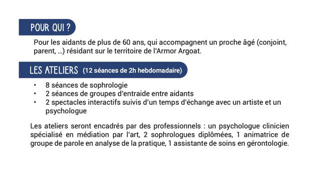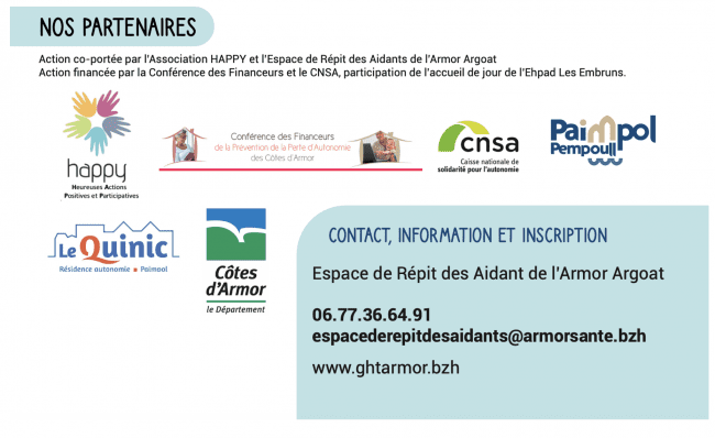 Ce dispositif, entièrement pris en charge, s’adresse aux aidants de plus de 60 ans qui accompagnent un proche âgé — conjoint, parent, voisin — et résident sur le territoire de l’Armor-Argoat.